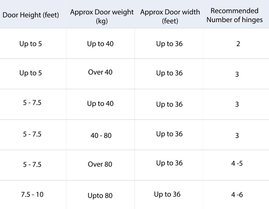 Recommended Number of Hinges Based on Door Height, Weight, and Width