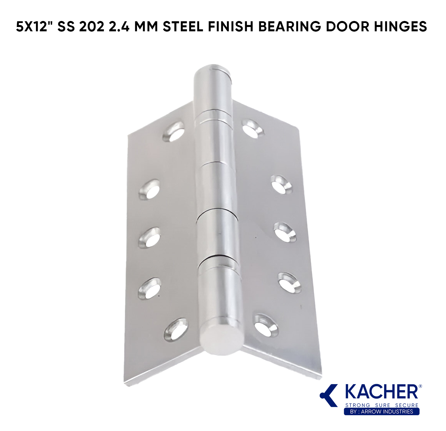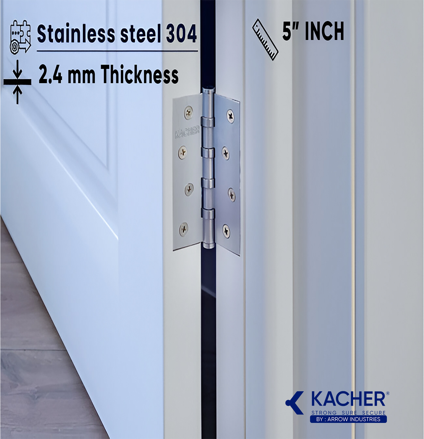 Select for Demanding Residential and Commercial Applications. The Kacher 5×12″ SS 304 Ball Bearing Butt Hinge is highly versatile. It’s perfect for a broad range of heavy-duty applications. Use it for main entry doors, large commercial doors, industrial gates, or any high-usage access point. Its robust nature and smooth operation make it a top choice. It meets the most stringent aesthetic and functional demands.