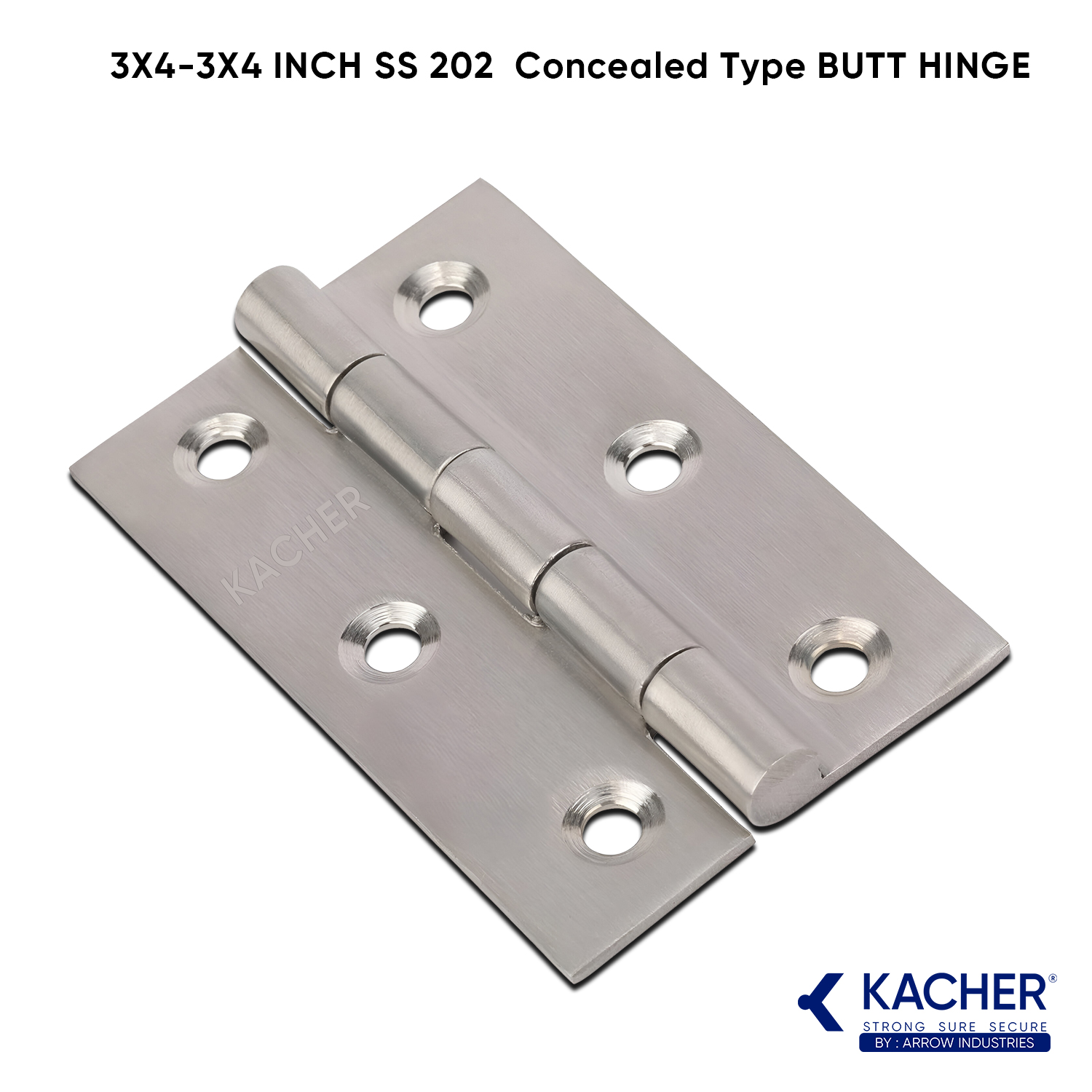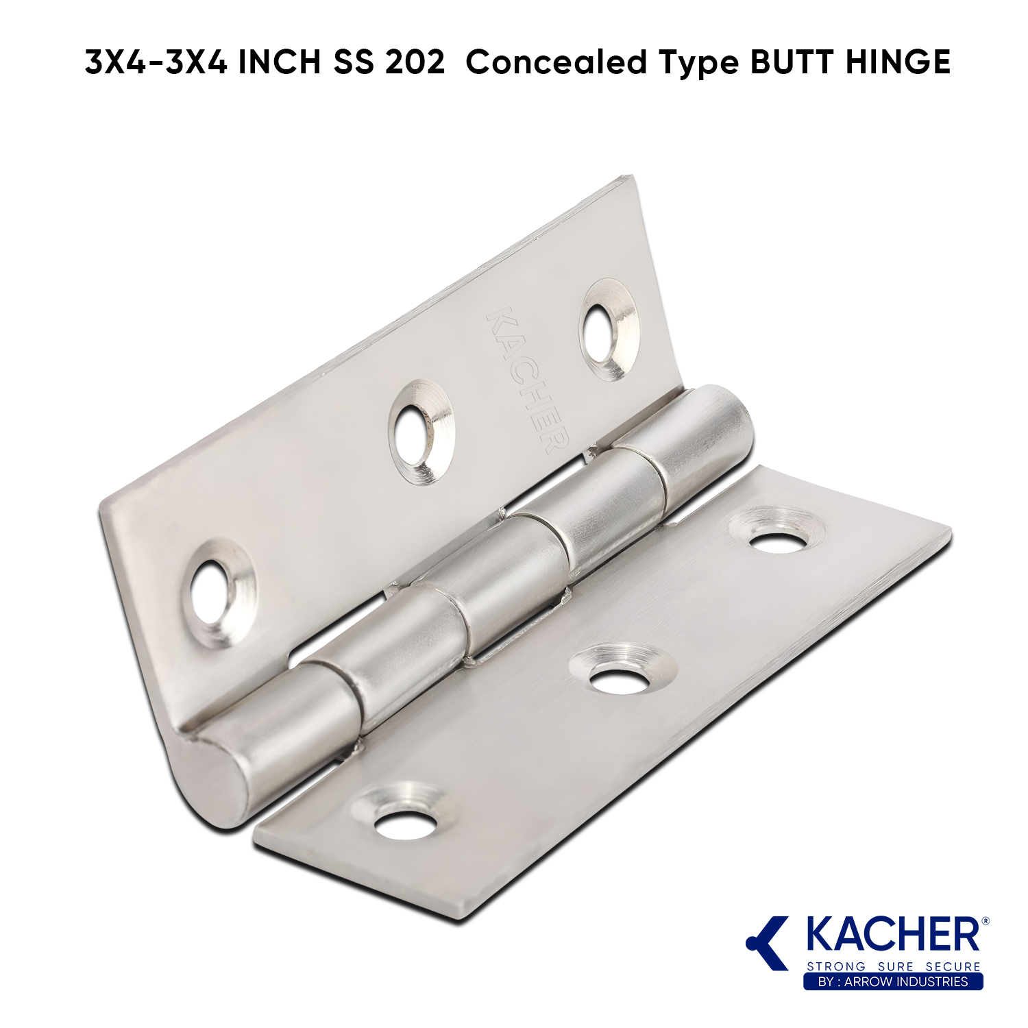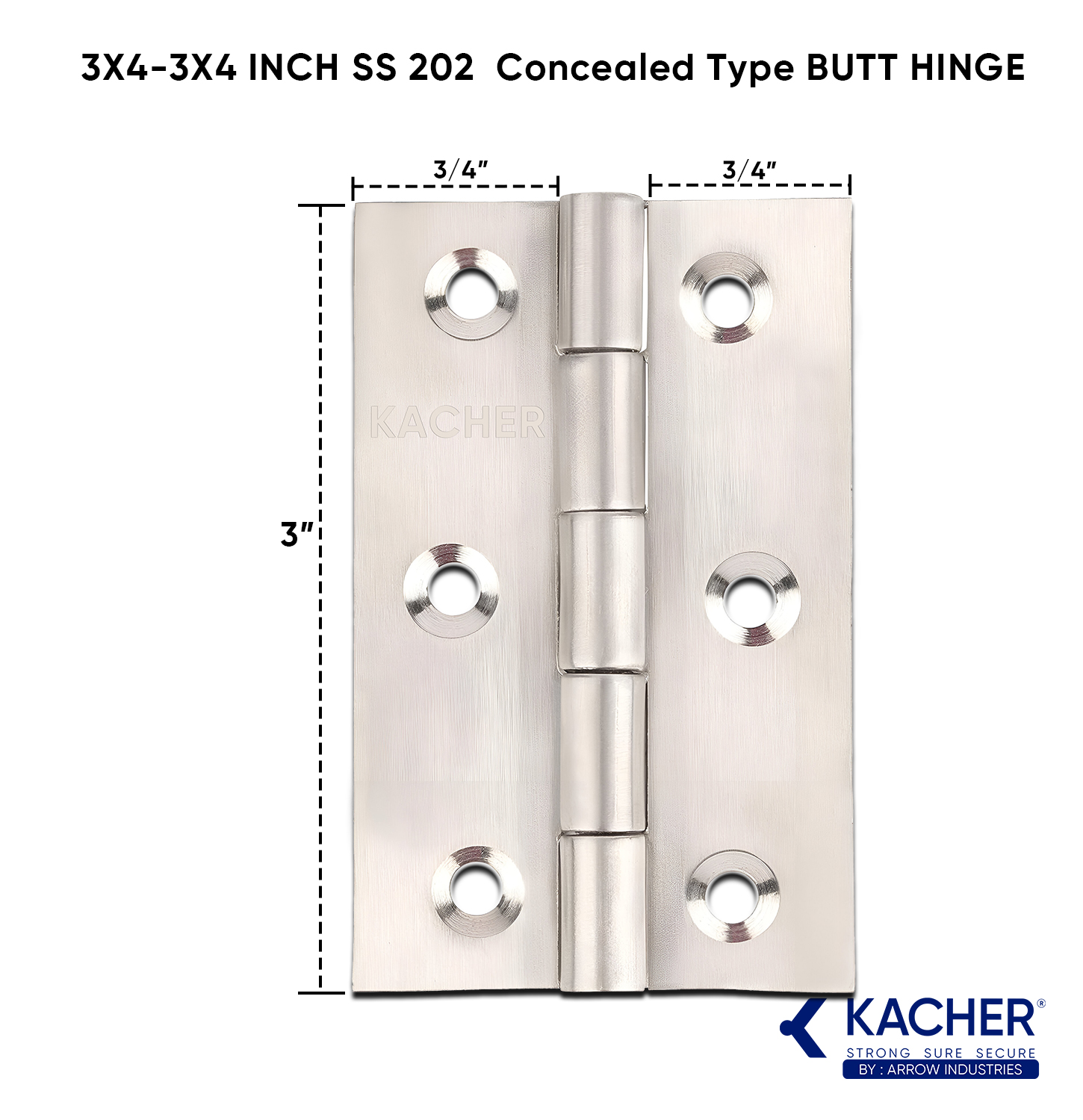 Kacher 3×4-3×4 Inch SS 202 Concealed Hinge are designed for strength, durability, and smooth operation in both residential and commercial use. Built with SS-202 grade steel and a robust welded steel finish, they are perfect for large cabinet doors, wooden doors, and wardrobes requiring high load-bearing capacity.Elevate your furniture and small-scale projects with the Kacher 3/4 x 3/4″ Butt Hinge SS 202 Concealed Hinge. Engineered for exceptional durability and a flawless, hidden aesthetic, these hinges are crafted from high-grade stainless steel. As a concealed, welded head type, they offer superior corrosion resistance and robust support for various small door and cabinet applications. With a precise 1.4 mm thickness and a versatile finish, they ensure smooth, reliable operation, maintaining a clean and seamless look.