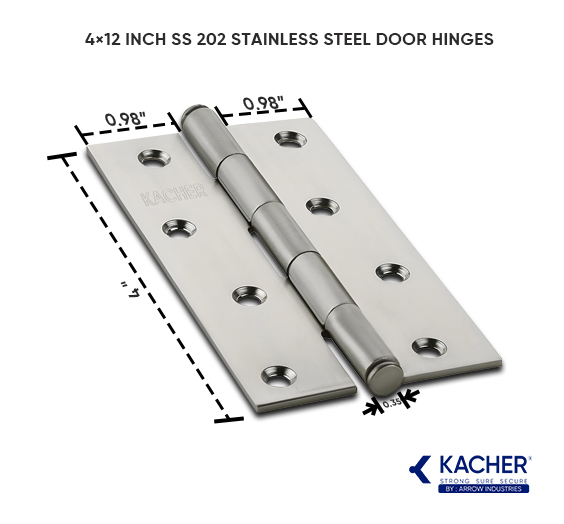 Kacher’s 4×12 inch SS 202 pin type door hinges are engineered for unmatched strength, long-term reliability, and smooth functionality. With a 2.40 mm thick stainless steel build and corrosion-resistant finish, they’re trusted by professionals for residential and commercial door applications. Whether you’re upgrading interior doors or reinforcing heavy-duty gates, Kacher delivers quality and performance you can rely on.